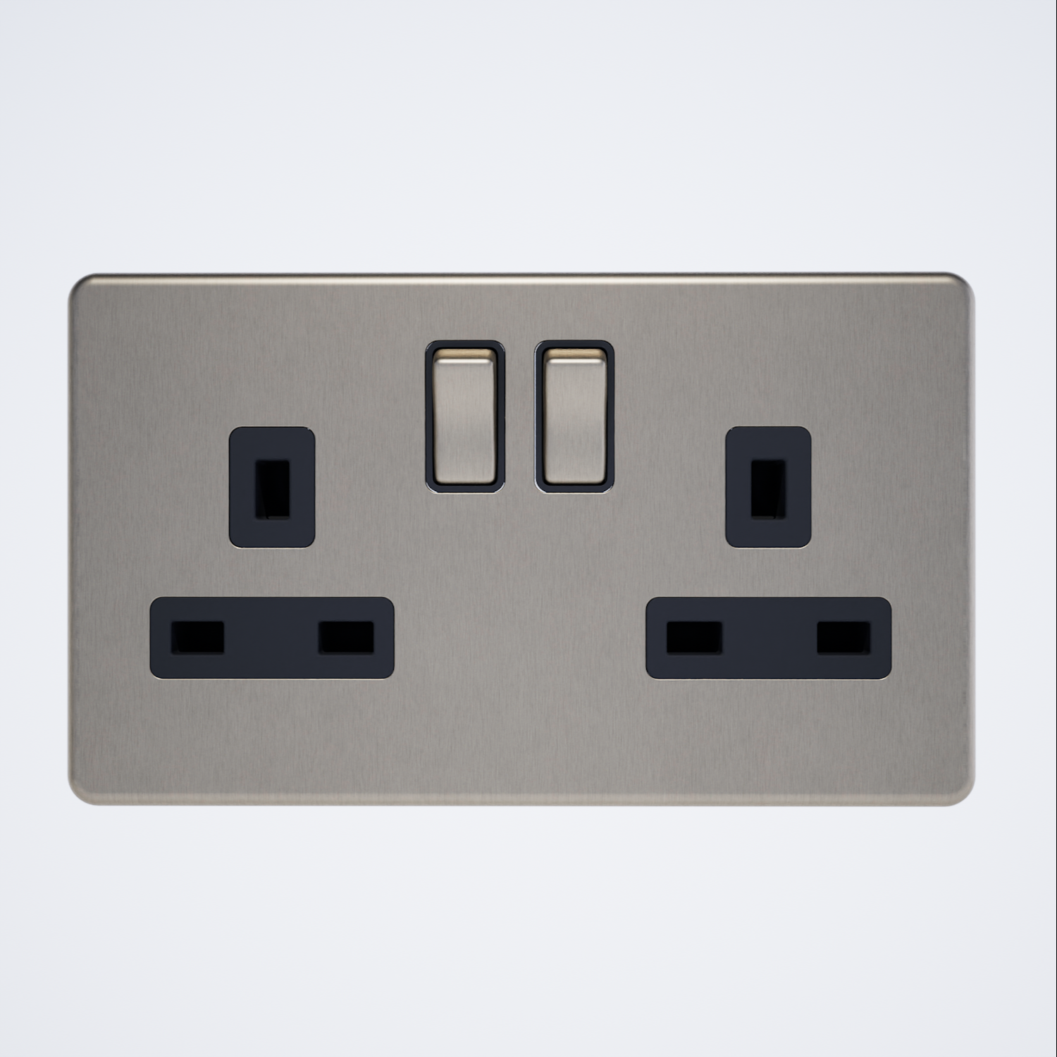 double screwless plug socket in brushed steel with black inserts is ordered in from our warehouse and will be shipped as soon as we receive it.