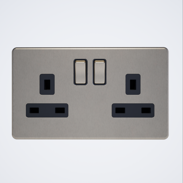 The Caradok 2 Gang 13a Double Pole metal socket is designed with brushed steel and black inserts for a sleek, modern look. With double pole functionality, this socket ensures a safe and reliable power connection. Upgrade your home or office with this durable and stylish socket.