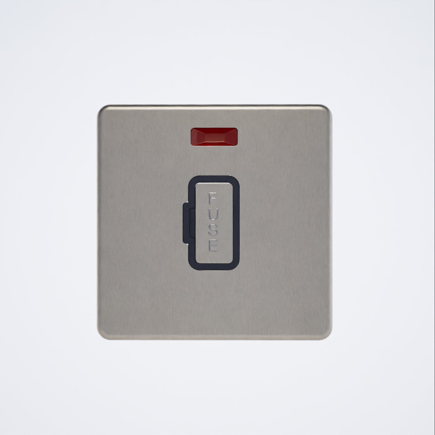 screwless 13A unswitched spur with neon in brushed steel with black inserts
