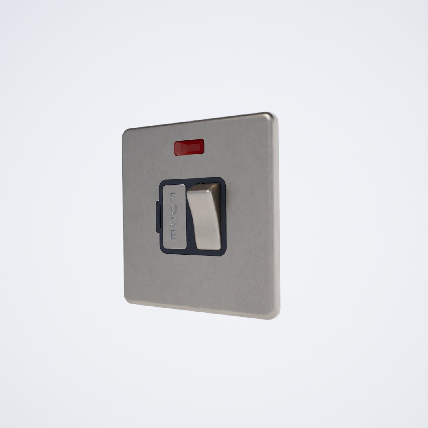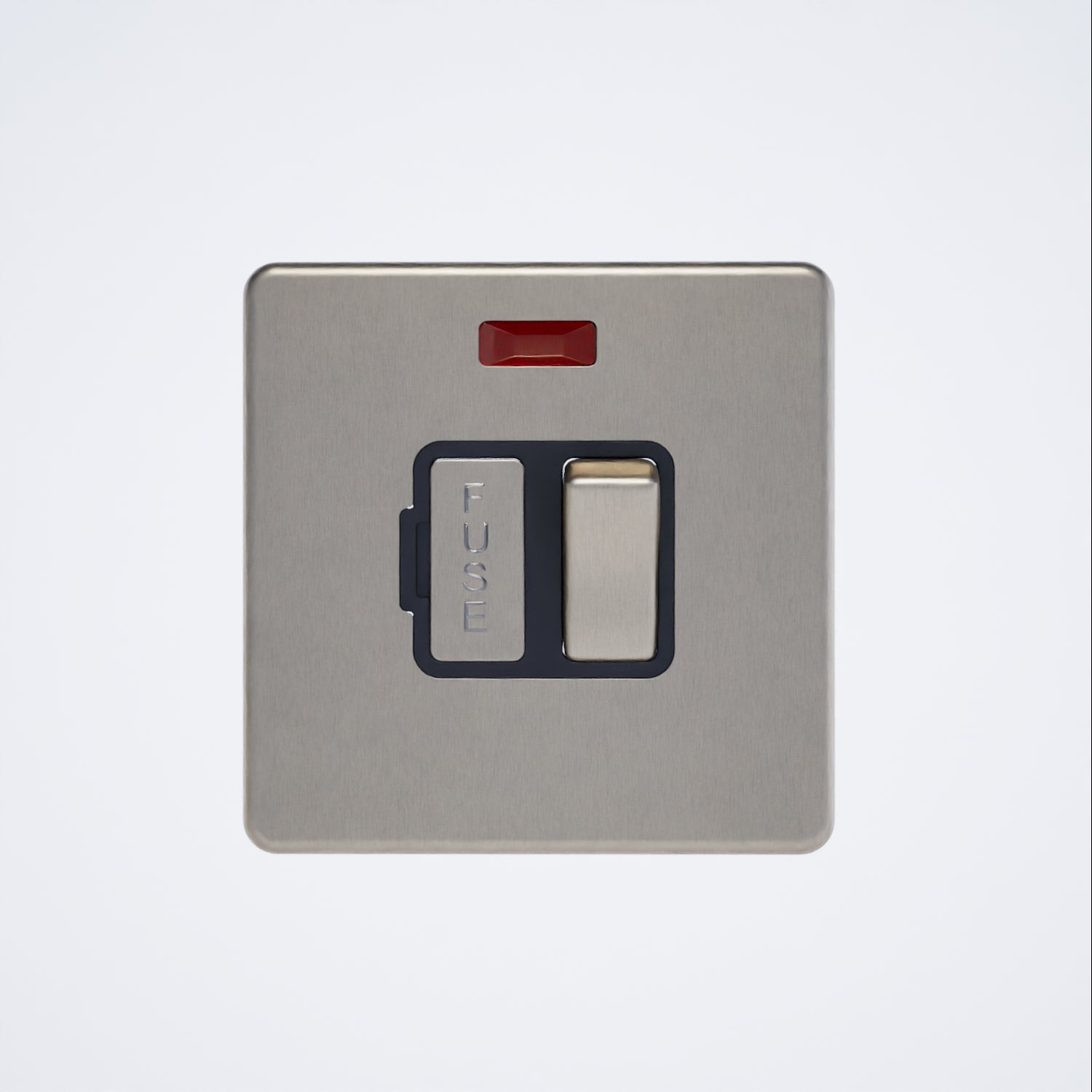 This brushed chrome 13A switched spur features a screwless design and an integrated neon indicator for clear operational status.