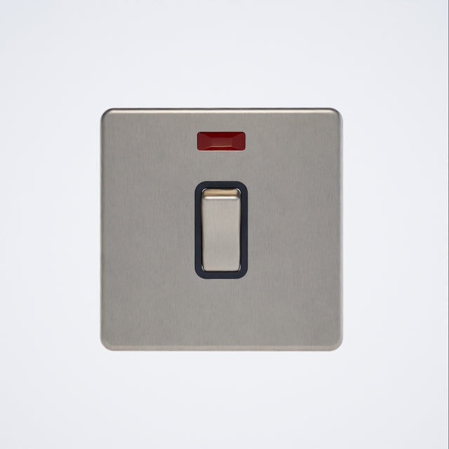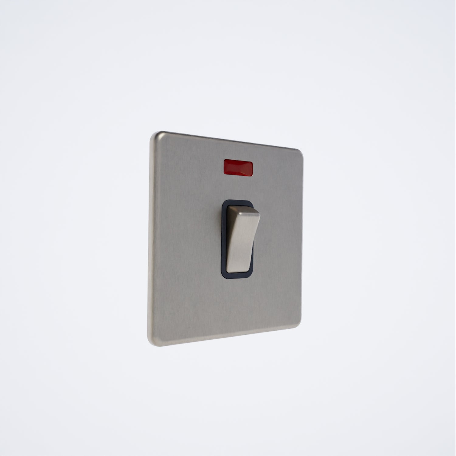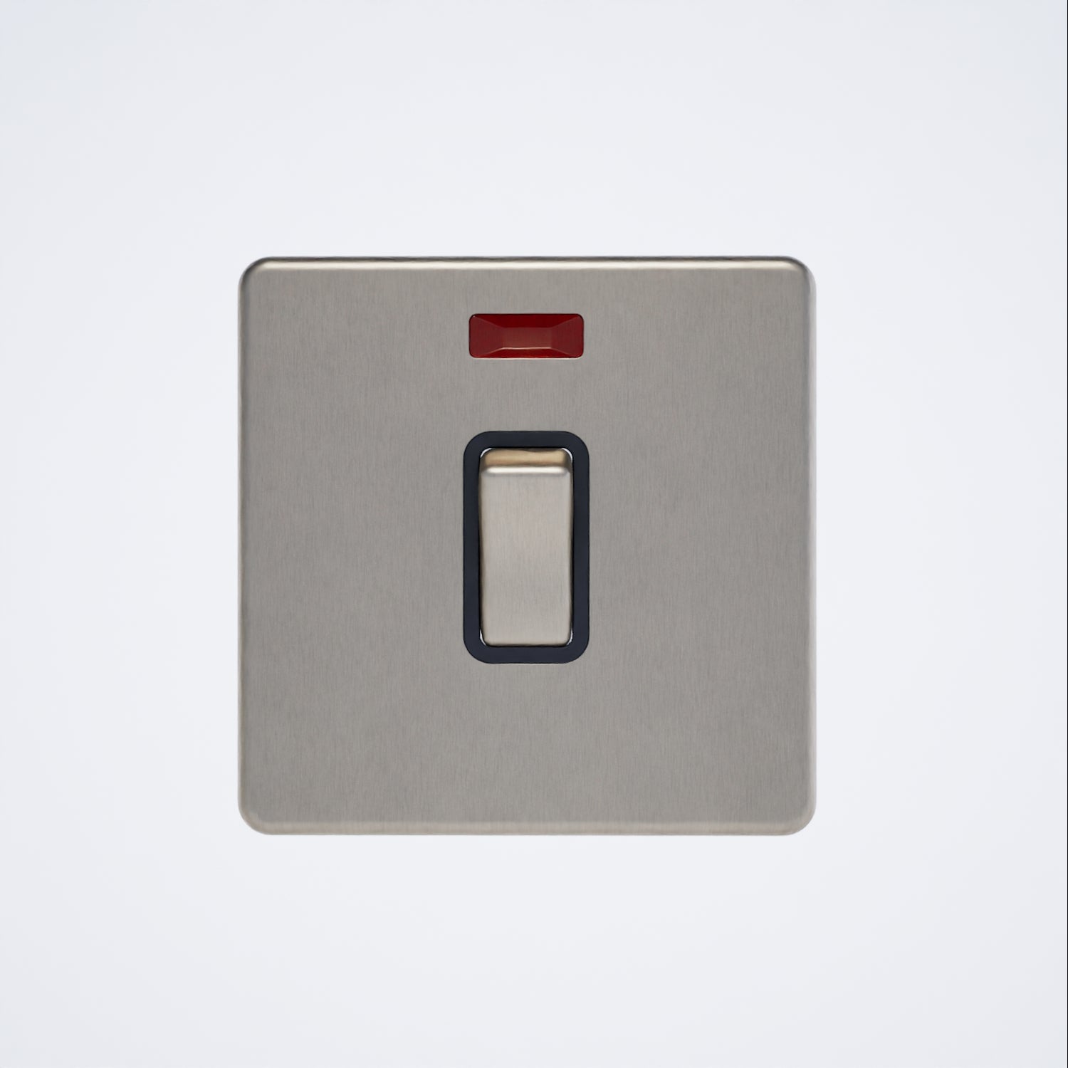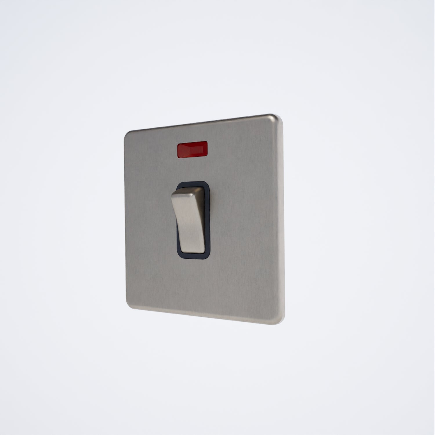 20A double pole switch with screwless design and neon indicator, finished in brushed chrome.